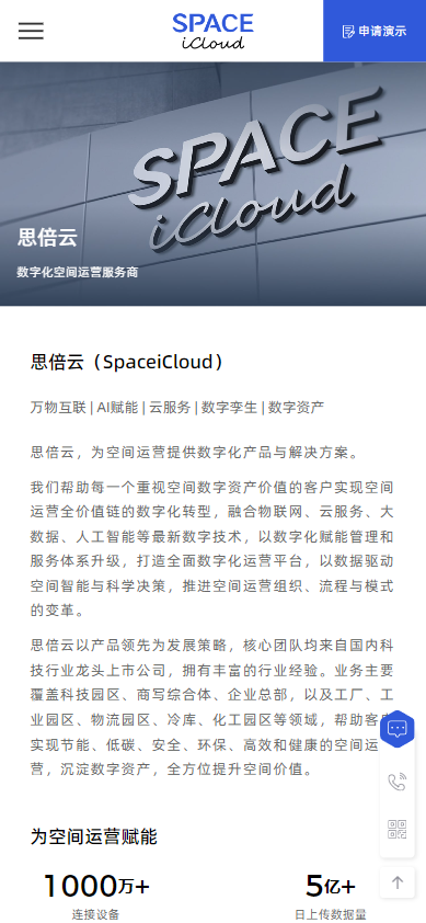 广州卓越迈创公司和思倍云结成战略合作伙伴关系,通过定制专业的品牌网站形象,展示企业的空间运营的数字化,设计采取白黑蓝色彩风格,让网站看起来更加可靠和大气。